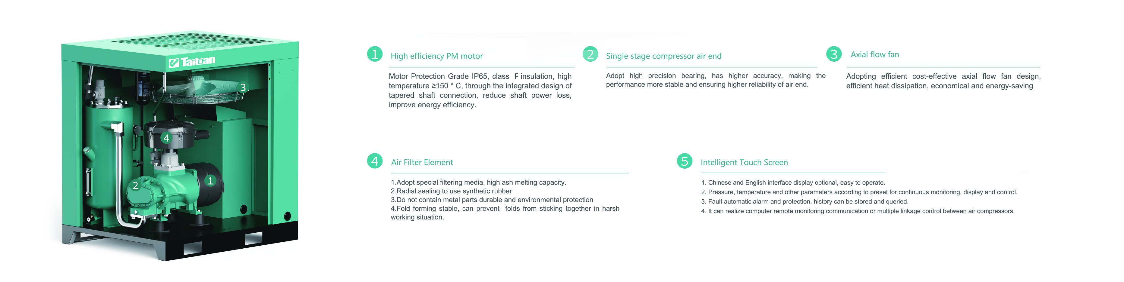 1.Designed with 4 high-precision bearings, energy-saving compressor;